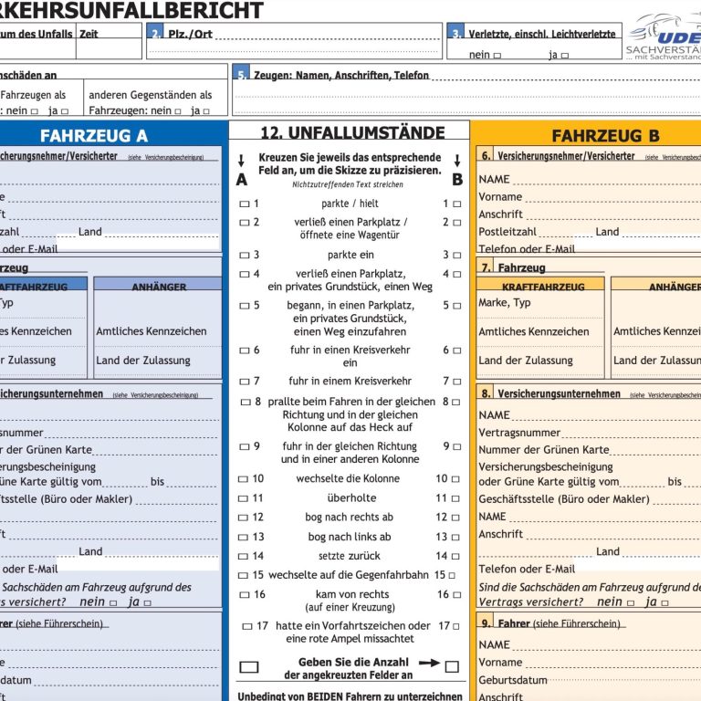 Ein Verkehrsunfall ist schnell passiert – umso wichtiger ist eine korrekte und vollständige Dokumentation. Der Europäische Unfallbericht hilft dabei, den Unfallhergang einheitlich, übersichtlich und europaweit verständlichfestzuhalten. Er wird von Versicherungen anerkannt und ist ein entscheidender Schritt für eine schnelle und reibungslose Schadenregulierung.